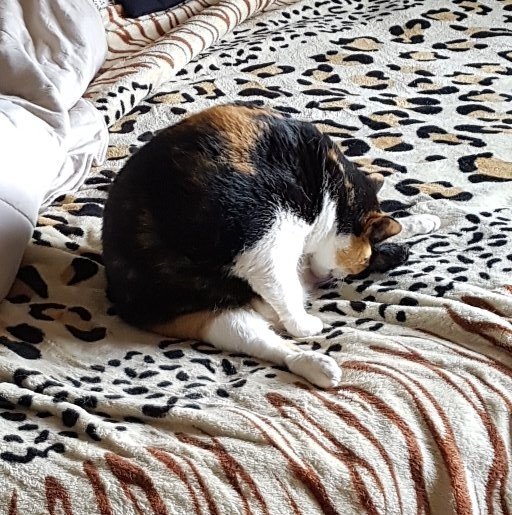 Hoje pela primeira vez em muito tempo a minha gata conseguiu se limpar sozinha. Isso pode parecer pouco mas ela estava obesa demais para alcançar as pernas e depois de perder um quilo ela está assim